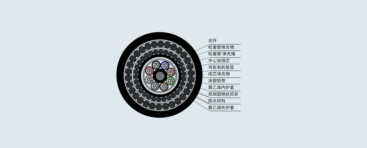 雙細圓鋼絲鎧裝結(jié)構(gòu),增加光纜抗壓、抗拉、防彈性能,有效防止嚙齒類効物啃傷