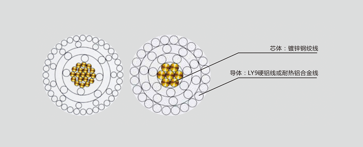 疏絞式 芯體:鍍鋅鋼絞線 導(dǎo)體:LY9硬鋁線或耐熱鋁合金線